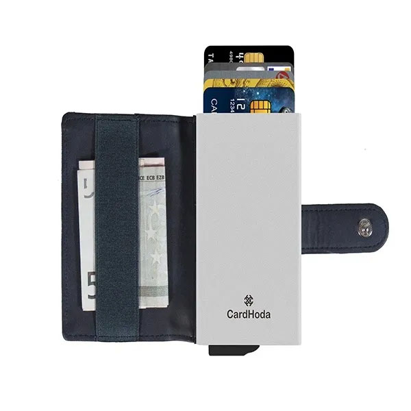 The minimalist wallet is one of the hottest categories at retail and now it’s available for your corporate or event logo. Stainless steel or carbon fiber. Comes with a hi tensile strength money clip, holds up to 8 cards and is RFID blocking. What is RFID?
